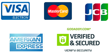 ビザカード 、マスターカード 、JCBカード、アメリカンエキスプレスをご利用いただけます。GoDaddyのセキュリティーシステムを使用していますので安心してご利用できます。